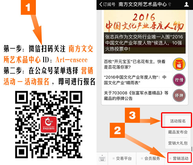 第一步:扫码关注官方微信公众号 南方文交所艺术品中心 ID:Art-cnscee;